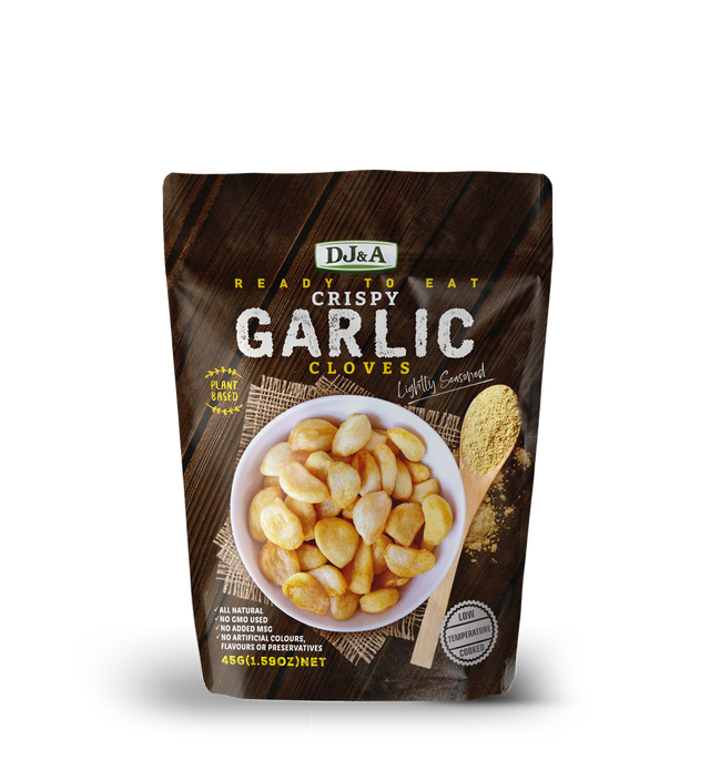 DJ&A Crispy Garlic Cloves is all natural, plant based. It contains no added MSG, no genetically modified vegetables and no artificial colours, flavours or preservatives.