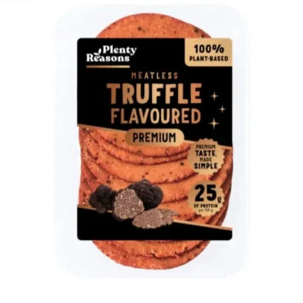 Plenty Reasons Truffle Flavoured Ham is a fantastic vegan meat alternative that features white truffle flavouring. Thanks to the unique blend of vegetable protein and fibres used, we love its outstandingly “meaty” texture and slightly beechwood-smoked notes.