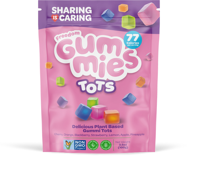 - Freedom Gummies “Tots”: Treat yourself to our plant-based juicy gummi cubes, bursting with mouthwatering flavours including apple, strawberry, orange, cherry, blackberry, and lemon. Crafted without any animal-derived ingredients, they offer a delightful and guilt-free snacking experience.