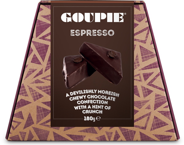 A no-nonsense flavour Espresso Goupie. Into our classic Goupie base we add a triple certified ground Arabica coffee before it's fully encapsulated by a 54% Belgian chocolate and hand-topped with a whole coffee bean. This is not a flavouring, we repeat, this is not a flavouring! Just pure, unadulterated, coffee. What better way to complement this flavour than snacking alongside a double espresso whilst you get down to business?